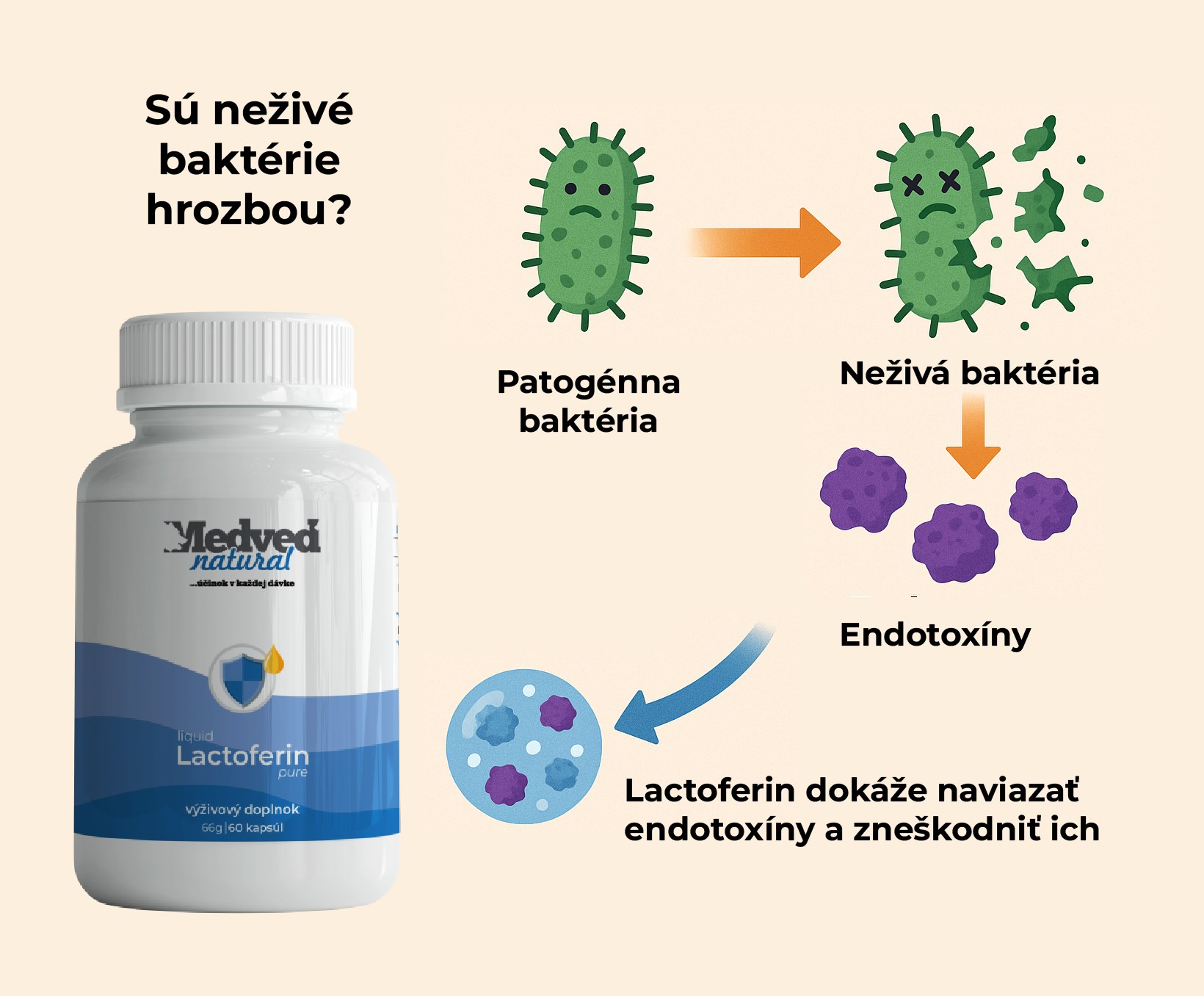 Živé baktérie nie sú to jediné nebezpečné čo ohrozuje naše zdravie. Nebezpečné sú aj toxíny, ktoré po sebe "zanechávajú" po svojom usmrtení napr. antibiotikami. Nakoľko je laktoferín najúčinnejšou látkou, ktorá v tele vychytáva endotoxíny, je dobré ho užívať počas a po antibiotickej liečbe. Takto sa chránite pred zápalovými látkami.